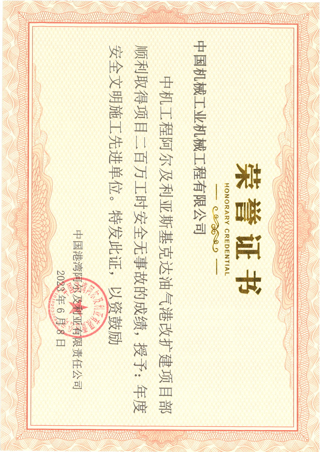 自項目開工以來,項目部高度重視安全生產工作,始終(zhōng)把安全生產放在首位,在項目部全體人員(yuán)的不懈努力,項目安(ān)全工作取得新的成績,榮獲建設方阿爾及利亞國(guó)家石(shí)油公司SONATRACH項目及中國港灣阿爾及利亞公司頒發的(de)榮譽證書,這是繼去年(nián)之後再次獲得該項榮譽稱號,也是對項目安全工作的認可和肯定。