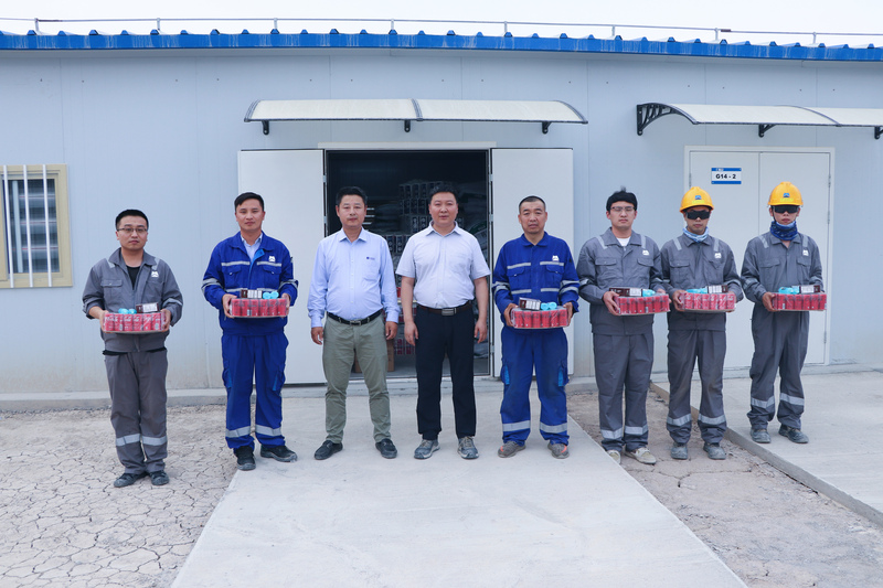 在項目營(yíng)地現場,王宏博(bó)與奮戰在海外施(shī)工生產一線的(de)員工們進行親切交談,對大家(jiā)長期堅守海(hǎi)外,支(zhī)持(chí)公司海外項目建設表示感謝,並詳(xiáng)細詢問記(jì)錄大家工作生活中遇到的困難,囑咐大家要增強安(ān)全生產意識,做好日常防護,合理安排工作時間,切實保證好(hǎo)高溫下的(de)自身安全。隨後,王(wáng)宏(hóng)博為職工們發放了公司精心準備的冷飲、驅蚊藥品等清涼大禮包(bāo)。