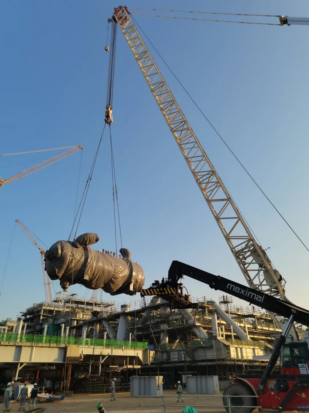 這台高壓火炬散蒸罐是(shì)Scarborough項目FPU模塊底層最重的靜設備,是中層甲板扣片的關鍵點,也(yě)是本項目四百萬無損工工時重要節點,業主方和EPC總包方(fāng)非常重視(shì),全程在現場觀摩指導。經過項目團隊的充(chōng)分準備、團結(jié)合作,安全精準的完成吊裝(zhuāng)任務,獲得業主(zhǔ)和EPC總包的高度讚揚,為後續FPU模塊建造打下堅實基礎。