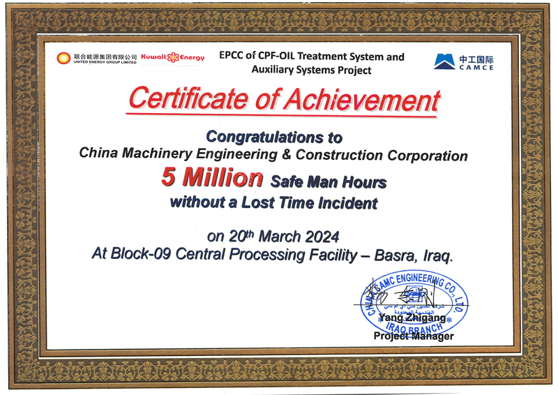 近(jìn)日,伊拉克九區油氣中央處理設(shè)施項(xiàng)目安全生產工作實現新突(tū)破(pò),公司獲頒500萬安全人工時榮(róng)譽(yù)證書。