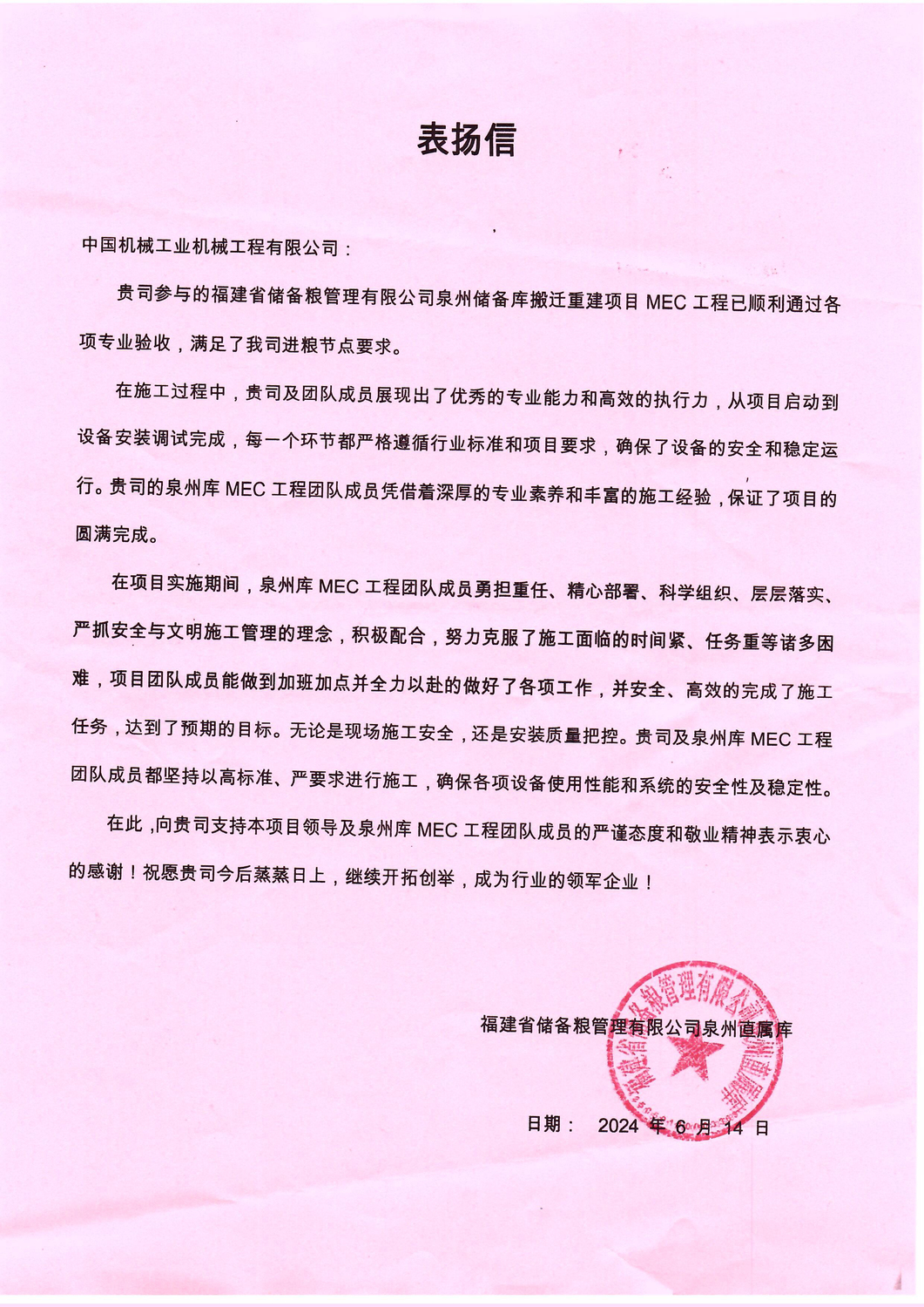 近日,福(fú)建省儲備糧管理有限公司泉州直屬庫發來表揚信,公司承(chéng)建的福建儲備糧管理有限(xiàn)公司泉州儲備庫搬遷重建MEC項目順利通過各項專業(yè)驗收,滿(mǎn)足了其進糧節點要求(qiú),對項目團隊的辛苦付出表(biǎo)示感謝。